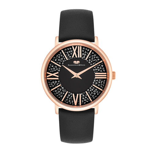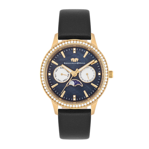 Damen Multifunktionsuhr gelbgold Echtleder schwarz